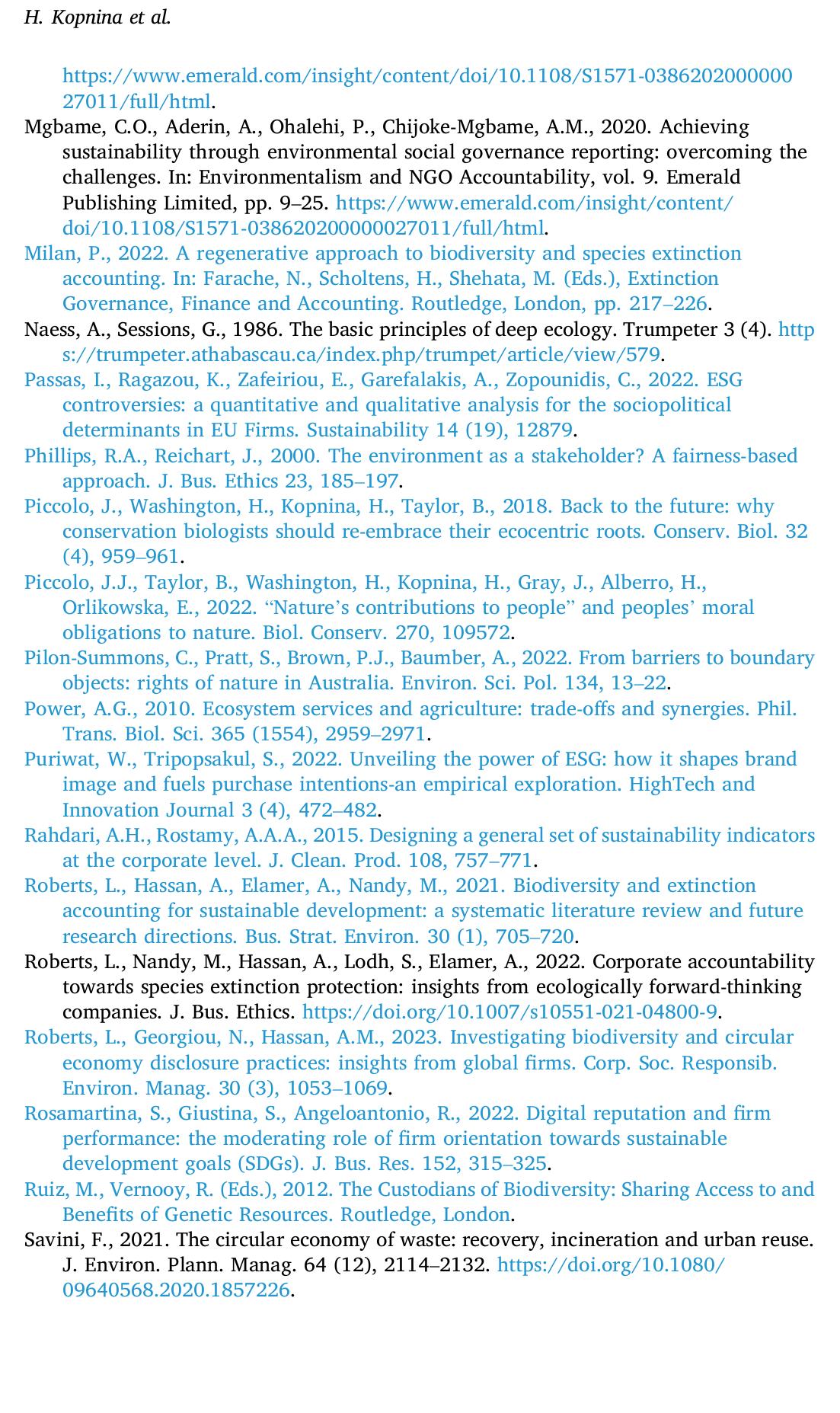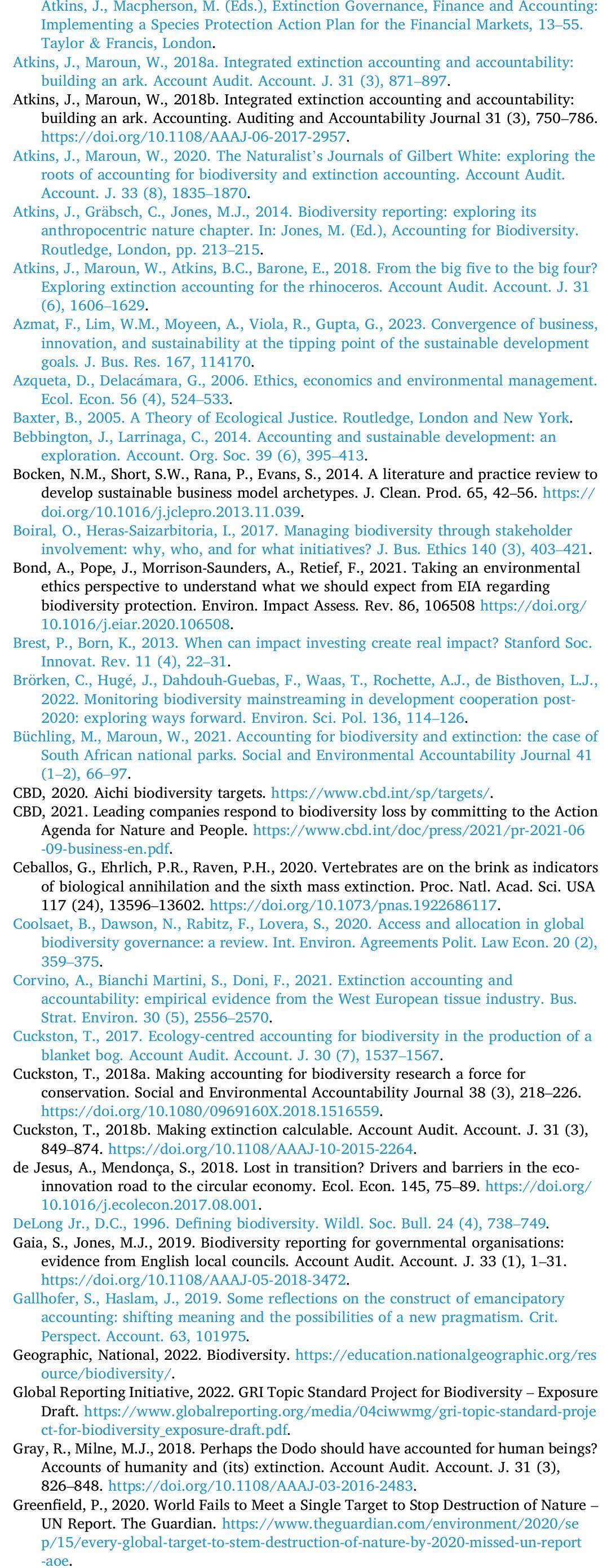 Traditional Environmental, Social, and Governance (ESG) metrics have primarily focused on promoti... more Traditional Environmental, Social, and Governance (ESG) metrics have primarily focused on promoting sustainable finance, positive screening, and sustainability reporting. However, recent research highlights the urgency for greater accountability and action to counter species extinction. This article explores the potential of ESG frameworks in guiding corporate and managerial decision-making to address biodiversity loss. As the current ESG indicators exhibit an anthropocentric bias, limiting their effectiveness for protecting biodiversity, this article aims to strategically integrate pragmatic extinction accounting with an ecocentric (deep ecology) perspective. This perspective addresses the root causes of biodiversity loss and offers support to species that are perceived as economically, socially, or culturally unimportant. We present our findings as a call to all stakeholders—business and policy decision-makers, conservationists, and environmental organisations—to formulate robust, inclusive, and ecologically sensitive strategies incorporating deep ecological perspectives. The findings of this study include recommendations for the Global Reporting Initiative (GRI).